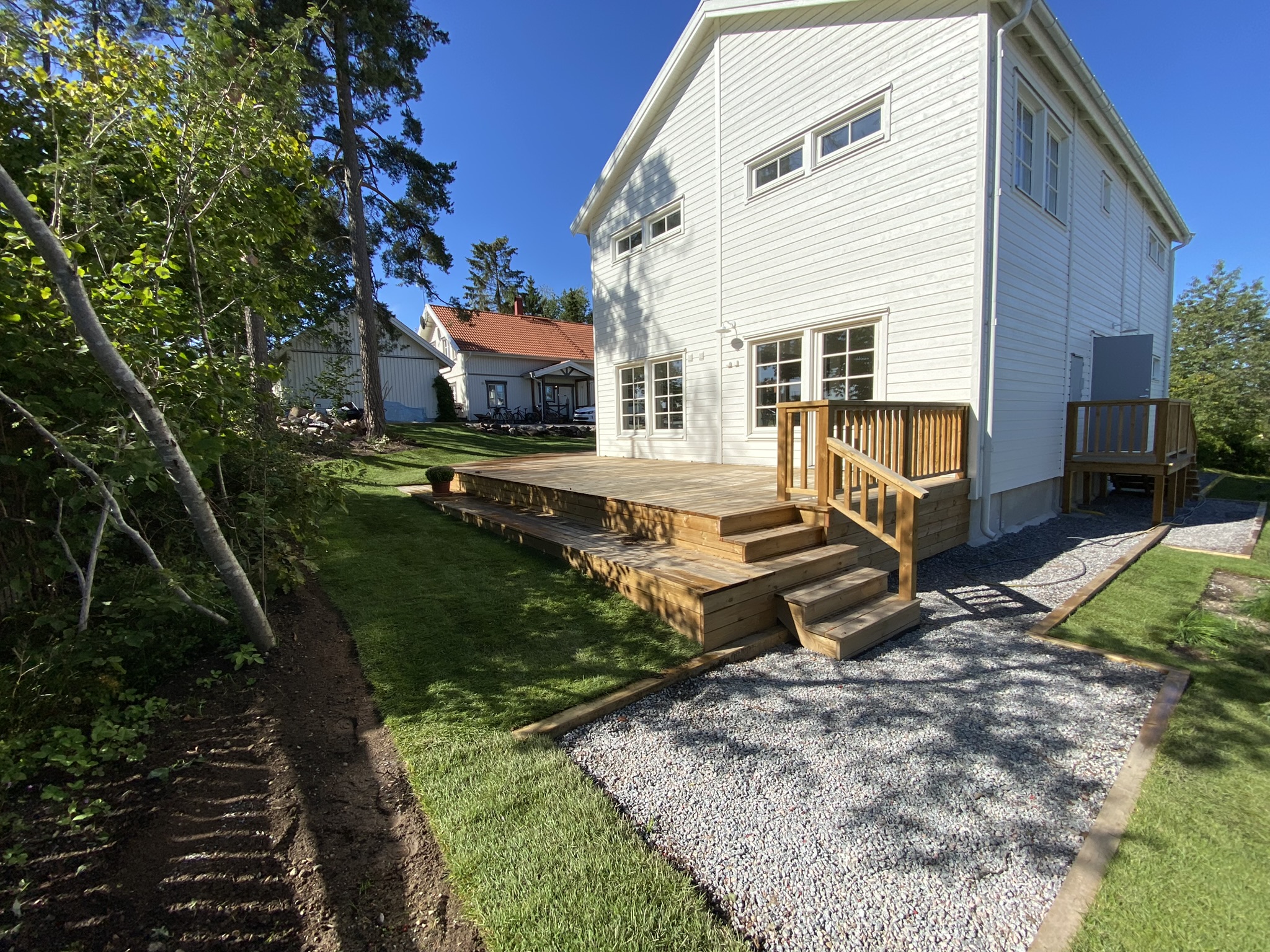 Terrasser i tryckimpregnerat eller exotiskt trä, natursten eller betong. Möjligheterna är i princip obegränsade.